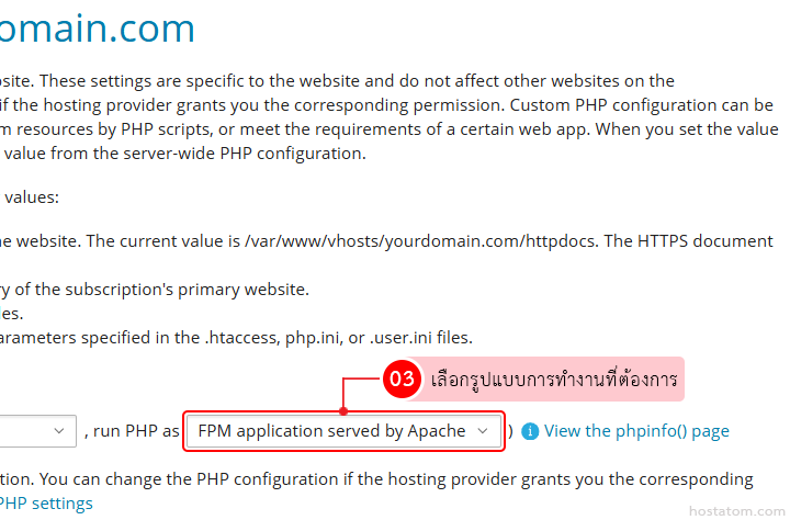 - ใช้งานทั่วไป เลือก FPM application served by Apache