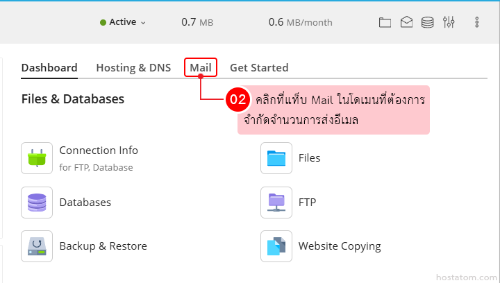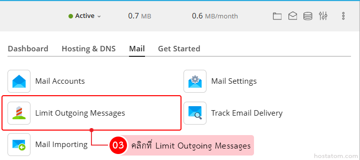 คลิกที่แท็บ Mail ในโดเมนที่ต้องการจำกัดจำนวนการส่งอีเมล