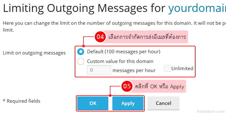 • Custom value for this domain กำหนดจำนวนการส่งอีเมลด้วยตัวเอง (ต่อชั่วโมง) หรือเลือกเป็น Unlimited หากไม่ต้องการจำกัดจำนวนการส่งเมล