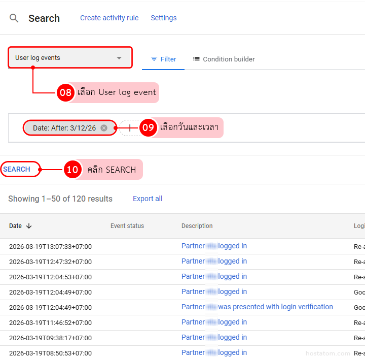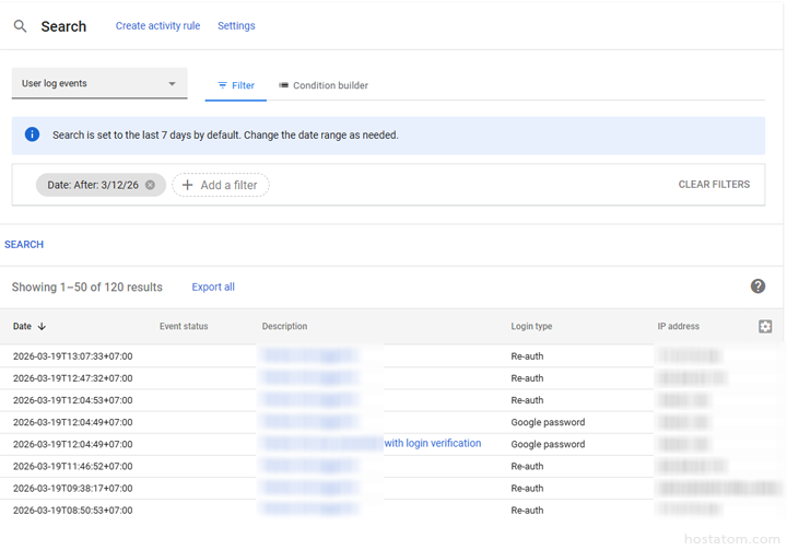 จะมี Log ให้เลือกหลากหลาย เช่น User log events, Admin log events, Gmail log events หรือ Profile log events