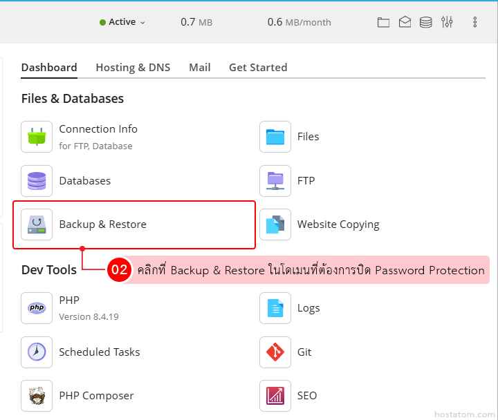 คลิกที่ Backup & Restore จากหัวข้อ Files & Databases ในโดเมนที่ต้องการปิด Password Protection