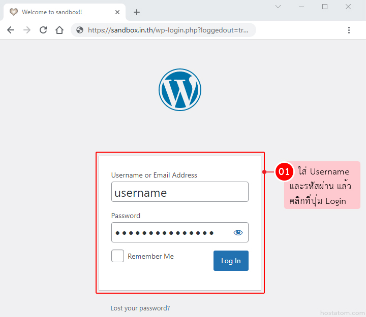 เข้าสู่หน้า WordPress Admin โดยพิมพ์ http://www.yourdomain.com/wp-admin ที่ web browser โดยเปลี่ยน yourdomain.com เป็นชื่อโดเมนของคุณ