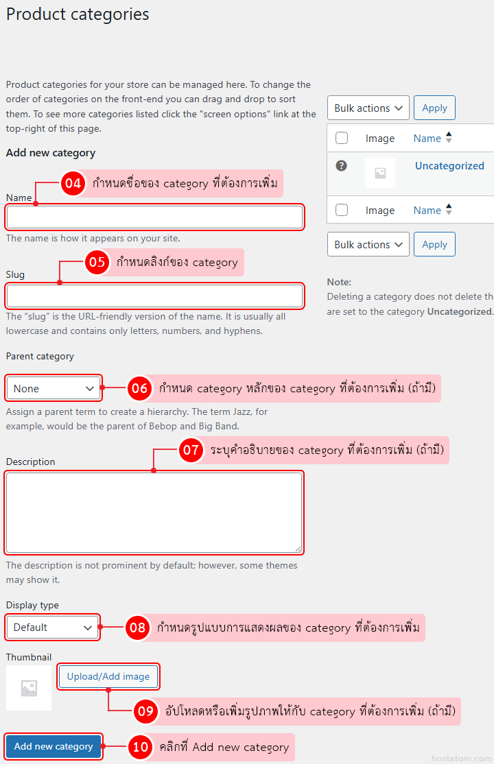- Thumbnail – อัปโหลดหรือเพิ่มรูปภาพให้กับ category ที่ต้องการเพิ่ม