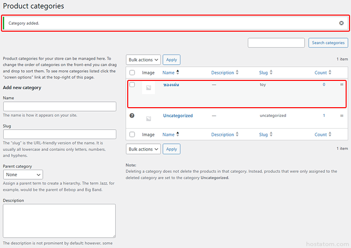 ระบบจะแจ้งว่าได้เพิ่ม category ดังกล่าวแล้ว และจะแสดง category ที่รายการ category ทางฝั่งขวาดังรูปตัวอย่าง