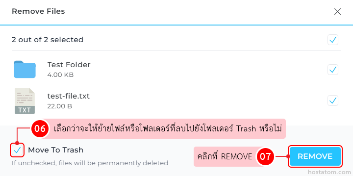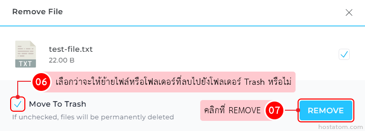 เลือกว่าจะให้ย้ายไฟล์หรือโฟลเดอร์ที่ลบไปยังโฟลเดอร์ Trash หรือไม่ในช่อง Move To Trash (ในค่าเริ่มต้นจะติ๊ก √ ไว้) จากนั้นคลิกที่ REMOVE
