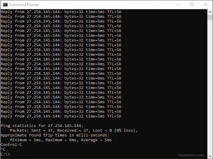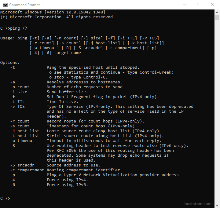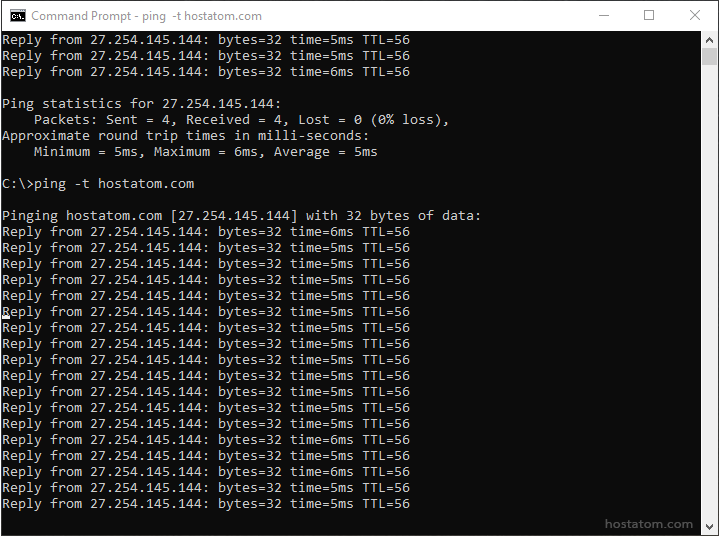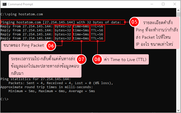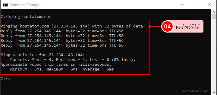 2. พิมพ์คำสั่ง ping แล้วตามด้วยชื่อโดเมนหรือ IP Address ที่ต้องการทราบค่า ยกตัวอย่างเช่น ping hostatom.com