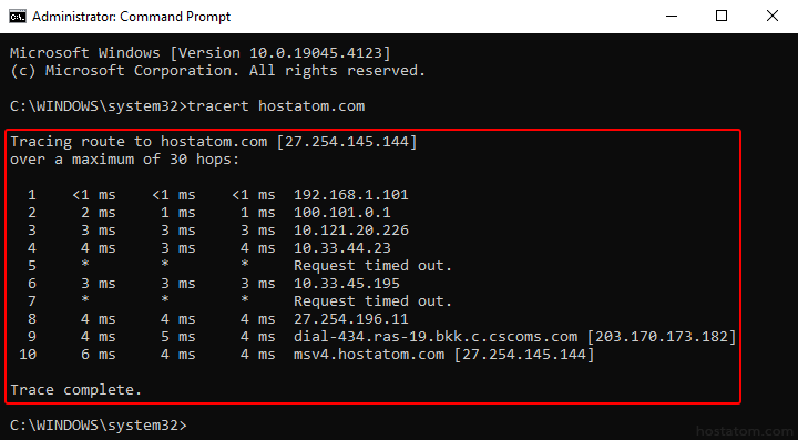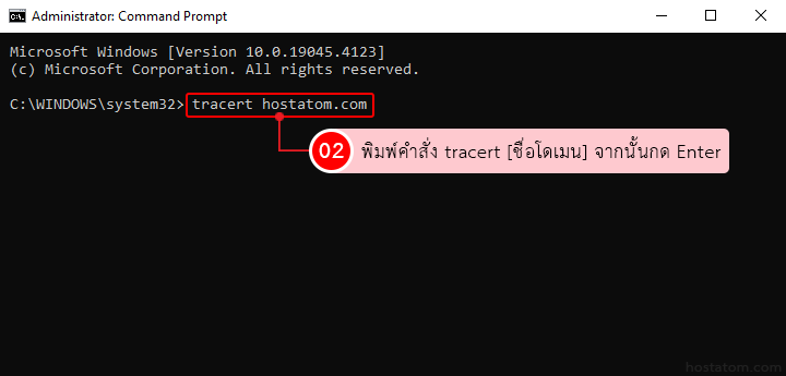 พิมพ์คำสั่ง tracert [ชื่อโดเมน] จากนั้นกด Enter (ในคู่มือนี้จะใช้เป็น tracert hostatom.com)
