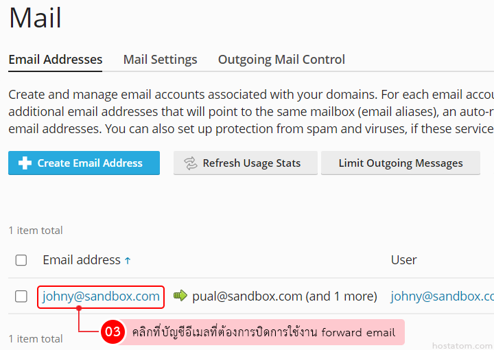 คลิกที่บัญชีอีเมลที่ต้องการปิดการใช้งาน forward email