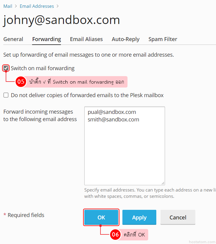 นำติ๊กถูกหน้า Switch on mail forwarding ออก จากนั้นคลิกที่ OK