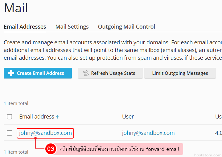 คลิกที่บัญชีอีเมลที่ต้องการเปิดการใช้งาน forward email