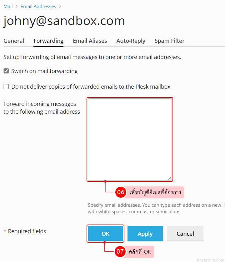 แต่หากใครไม่ต้องการให้ส่งอีเมลที่ Forward ไปเก็บไว้ใน Mailbox ก็ให้ติ๊กถูกหน้าข้อความ Do not deliver copies of forwarded emails to the Plesk mailbox จากนั้นคลิกที่ OK