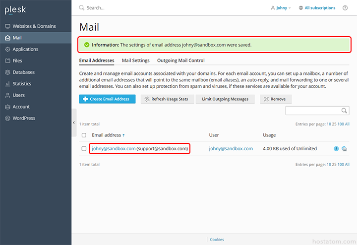 ระบบจะแจ้งว่าการตั้งค่าของอีเมลดังกล่าวได้ถูกบันทึกแล้ว (จะเห็นว่าอีเมล alias ที่เพิ่มไปจะแสดงอยู่ที่ท้ายชื่อบัญชีอีเมลที่เข้าไปเพิ่มอีเมล alias)