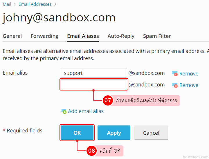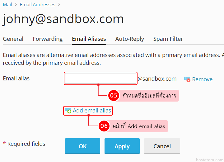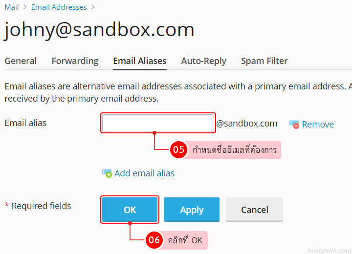 กำหนดชื่ออีเมลต่อไปที่ต้องการในช่อง Email alias หากเพิ่มอีเมล alias ครบตามที่ต้องการแล้ว ให้คลิกที่ OK