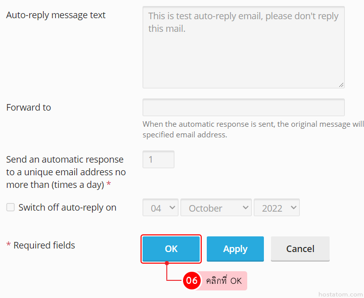 - Auto-reply message text – กำหนดข้อความที่จะแสดงในเมลตอบกลับ