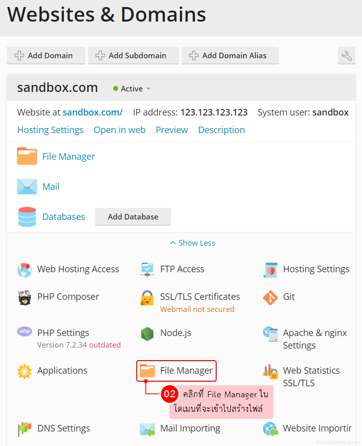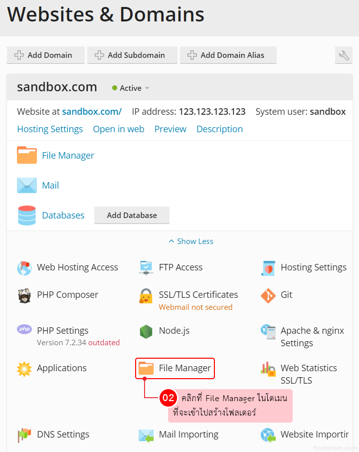 คลิกที่ File Manager ในโดเมนที่จะเข้าไปสร้างโฟลเดอร์