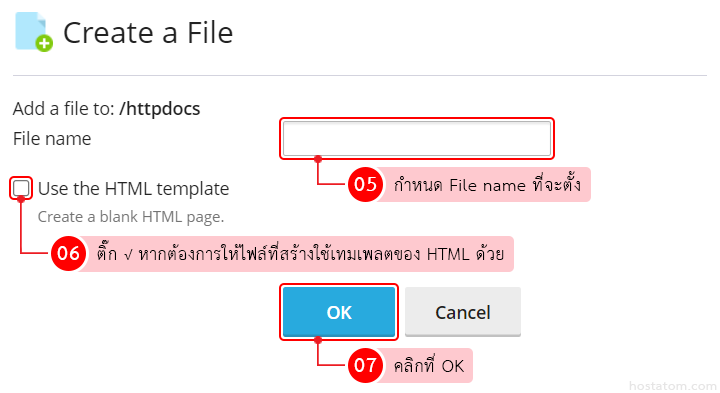 กำหนด File name ให้กับไฟล์ที่จะสร้าง และหากต้องการให้ไฟล์ที่สร้างใช้เทมเพลตของ HTML ด้วย ให้ติ๊กถูกที่ Use the HTML template จากนั้นคลิกที่ OK