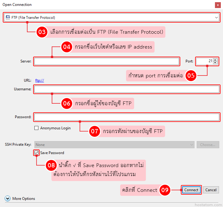 - Password – กรอกรหัสผ่านของบัญชี FTP