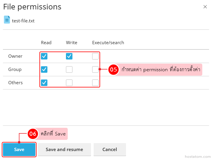 กำหนดค่า permission ที่ต้องการตั้งค่า เมื่อเสร็จแล้วให้คลิกที่ Save