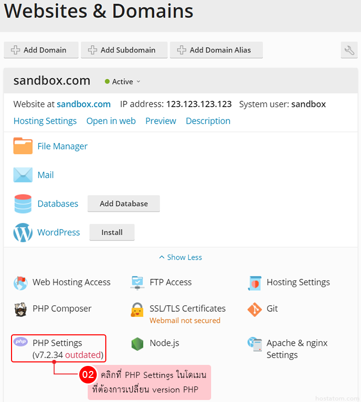 2. คลิกที่ PHP Settings ในโดเมนที่ต้องการเปลี่ยน version PHP