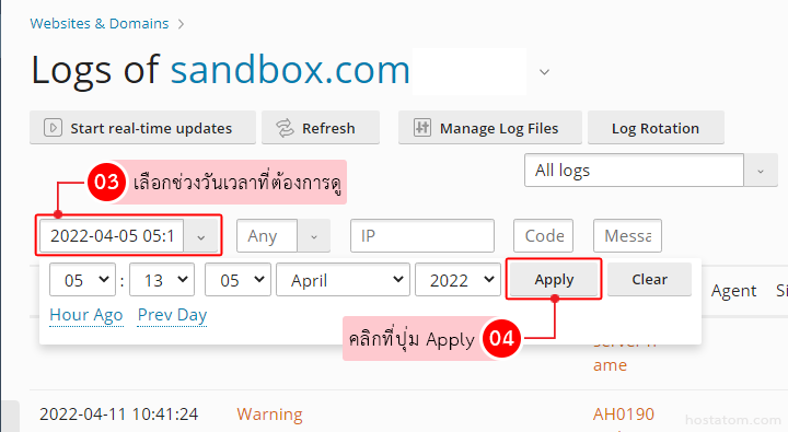 ต่อมาให้เลือกโดเมนที่ต้องการ จากนั้น เลือกเมนู Logs ดังภาพ