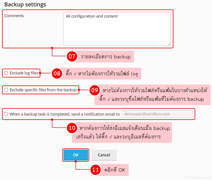 • When a backup task is completed, send a notification email to: หากต้องการให้ส่งอีเมลแจ้งเตือนเมื่อระบบทำ backup เสร็จแล้ว ให้ติ๊กถูกหน้าข้อความ พร้อมใส่ชื่ออีเมลที่ต้องการ
