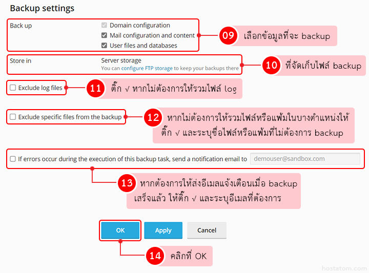 • If errors occur during the execution of this backup task, send a notification email to: หากต้องการให้ส่งอีเมลแจ้งเตือนเมื่อเกิดข้อผิดพลาดระหว่างการ backup ให้ติ๊กถูกหน้าข้อความ พร้อมใส่ชื่ออีเมลที่ต้องการ