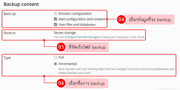 • Use incremental backup: หากต้องการสำรองข้อมูลเว็บไซต์และอีเมลเฉพาะไฟล์ที่มีการเปลี่ยนแปลงจาก backup ครั้งล่าสุดเท่านั้นให้ติ๊กถูกหน้าข้อความ