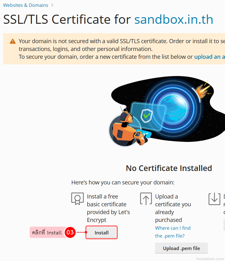 *** หมายเหตุ *** การติดตั้ง SSL แบบ Let’s Encrypt นั้น ในกรณีที่เป็นโดเมนจดทะเบียนใหม่ หรือมีการย้าย Server หลังจากชี้ Name Server แล้วให้รอ DNS อัปเดตเรียบร้อยเสียก่อน (อย่างน้อย 4-24 ชั่วโมง) ถึงจะติดตั้งได้