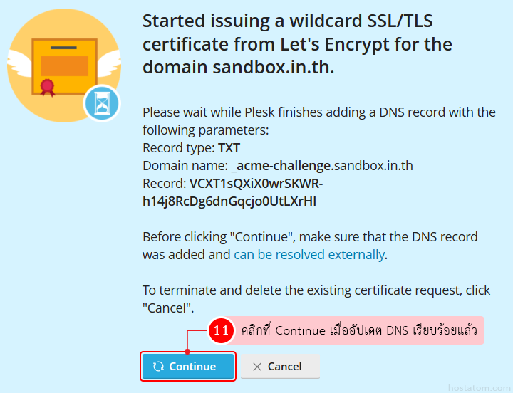 รอระบบทำการอัปเดต DNS และติดตั้ง SSL Certificate ให้กับเว็บไซต์จนเสร็จ หรือถ้าแน่ใจว่า DNS อัปเดตเรียบร้อยแล้วก็ให้คลิกที่ Continue (ในกรณีที่เลือกติดตั้ง SSL แบบ wildcard ระบบจะใช้เวลาอัปเดต DNS เป็นเวลา 24 ชั่วโมง)