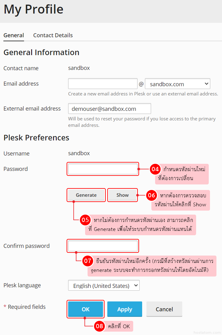 • Password: กรอกรหัสผ่านที่ต้องการเปลี่ยน กรณีที่ไม่ต้องการตั้งรหัสผ่านเองสามารถคลิกที่ Generate ได้ และสามารถคลิกที่ Show เพื่อดูรหัสผ่านที่ตั้งไว้ได้