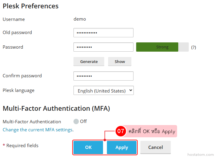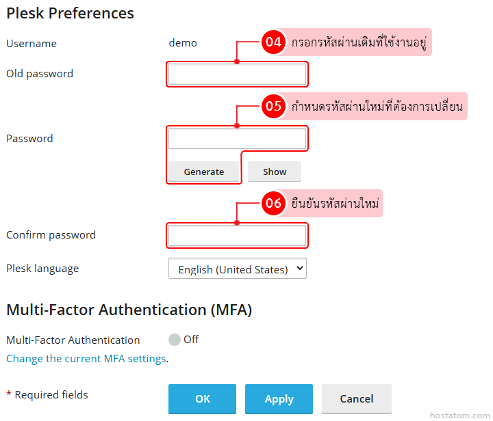 กำหนดรหัสผ่านใหม่ที่ต้องการเปลี่ยนในหัวข้อ Plesk Preferences