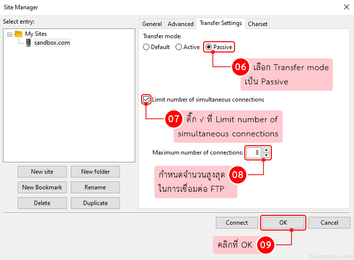 เลือก Transfer mode เป็นแบบ Passive ติ๊กถูกที่ Limit number of simultaneous connections และกำหนดจำนวนสูงในการเชื่อมต่อ FTP ใน Maximum number of connections (หากไม่แน่ใจว่าผู้ให้บริการโฮสติ้งของคุณอนุญาตให้เชื่อมต่อจำนวนเท่าไหร่ แนะนำให้ใส่ 8 หรือสอบถามกับทางผู้ให้บริการโฮสติ้งของคุณเพื่อความแน่ใจ) จากนั้นคลิกที่ OK