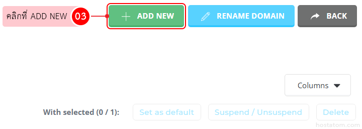 คลิกที่ ADD NEW (ตรวจสอบให้มั่นใจก่อนว่าโดเมนที่จะเพิ่มเข้าไปใหม่นั้นจดทะเบียนโดเมนเรียบร้อยแล้ว และทำการตั้งค่า nameserver มายังบริการที่ใช้งานอยู่ โดยคุณสามารถตรวจสอบค่า nameserver ของบริการที่ใช้งานอยู่ได้จากส่วนบริการลูกค้าของเรา)