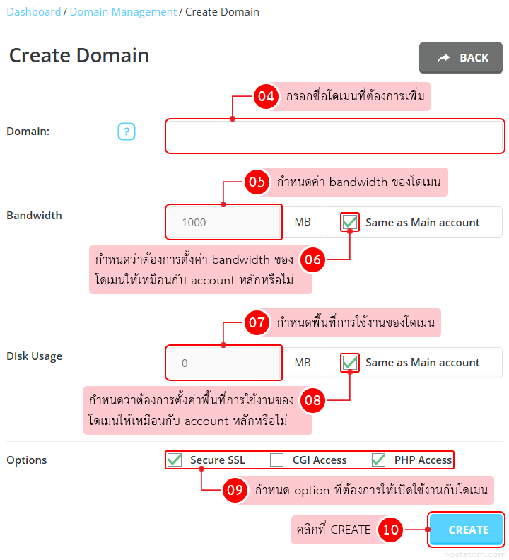 - Bandwidth : กำหนดค่า bandwidth ของโดเมน หรือจะติ๊กถูกที่ Same as Main Account หากต้องการตั้งค่า bandwidth ของโดเมนให้เหมือนกับ account หลัก