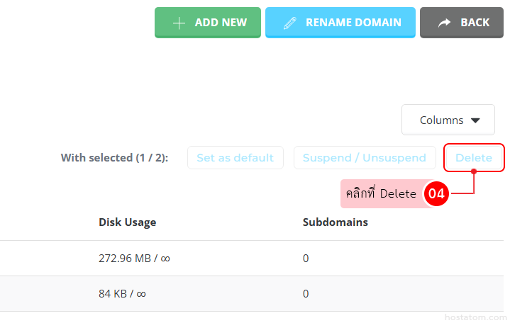 ***หมายเหตุ : การลบโดเมนจะเป็นการลบไฟล์ บัญชีอีเมล และข้อมูลทั้งหมดที่ถูกสร้างและอัปโหลดขึ้นมาที่โดเมนนี้ทั้งหมดออกจาก server ไปพร้อมๆ กันด้วย หากมีข้อมูลสำคัญที่อยู่บนโดเมนที่กำลังจะทำการลบ ให้ทำการสำรองข้อมูล หรือดาวน์โหลดข้อมูลนั้นๆ ออกจาก server ก่อน
