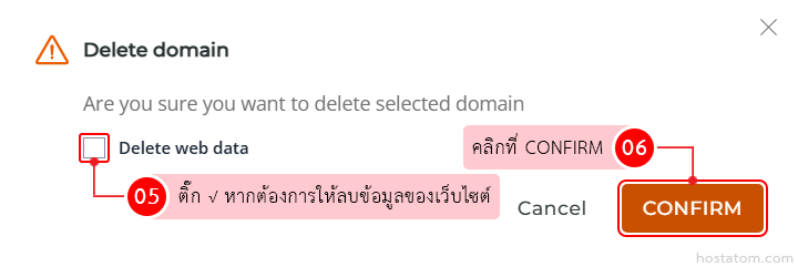ระบบจะแสดงหน้าต่างยืนยันการลบโดเมน หากต้องการให้ลบข้อมูลของเว็บไซต์ด้วย ให้ติ๊กถูกที่ Delete web data จากนั้นคลิกที่ DELETE