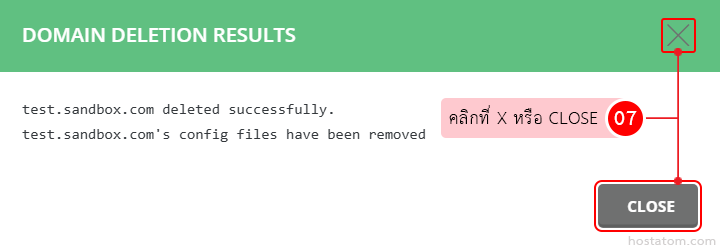 ระบบจะแจ้งว่าโดเมนดังกล่าวได้ถูกลบเรียบร้อยแล้ว จากนั้นคลิกที่ X หรือ CLOSE เพื่อปิดหน้าต่างแจ้งเตือน