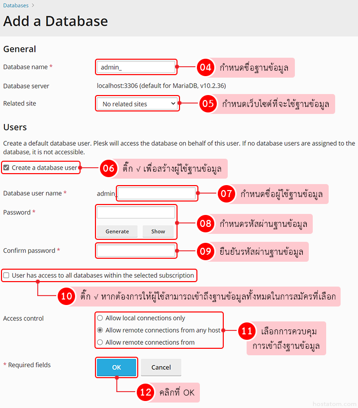 - Create a database user: ติ๊กถูกหน้าข้อความเพื่อสร้างผู้ใช้ฐานข้อมูล