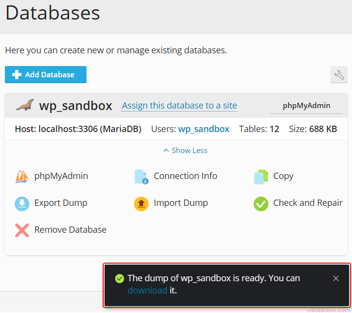 4. ระบบจะแจ้งว่าฐานข้อมูลดังกล่าวถูก export เรียบร้อยแล้ว สามารถคลิกที่ download เพื่อดาวน์โหลดไฟล์ฐานข้อมูลที่ export แล้วได้เลย