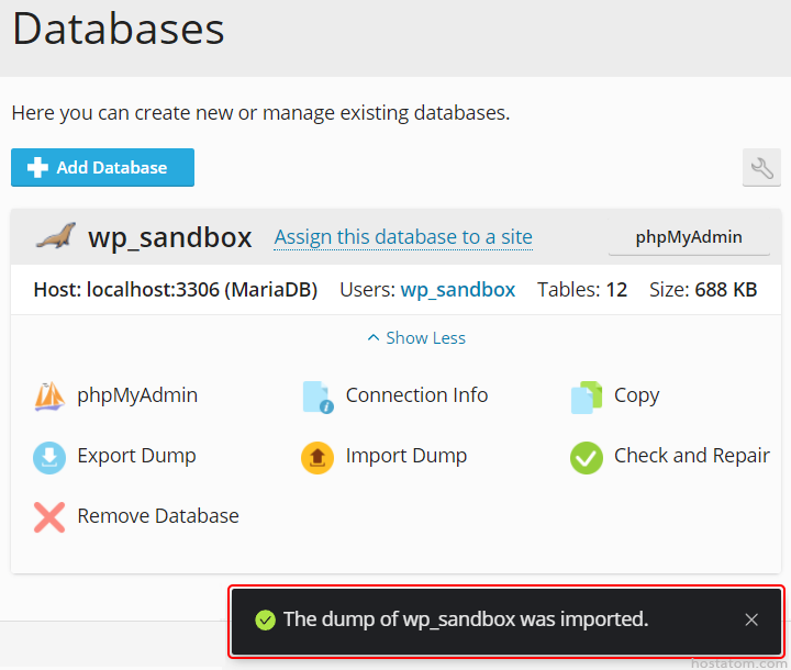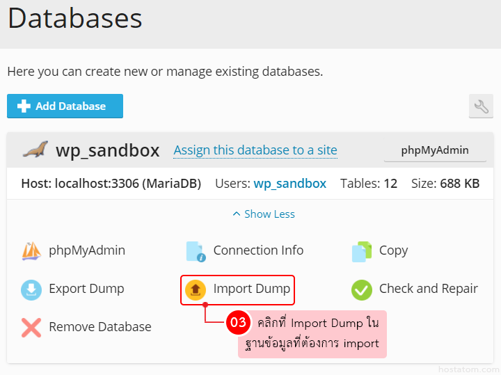 2. คลิกที่ Import Dump ในฐานข้อมูลที่ต้องการ import