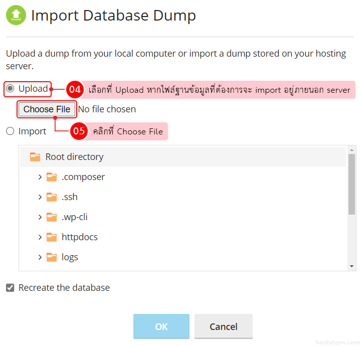3.1.1 หากไฟล์ฐานข้อมูลที่ต้องการจะ import อยู่ภายนอก server เช่นอยู่ในเครื่องคอมพิวเตอร์ของคุณ ให้เลือกที่ Upload จากนั้นคลิกที่ Choose File