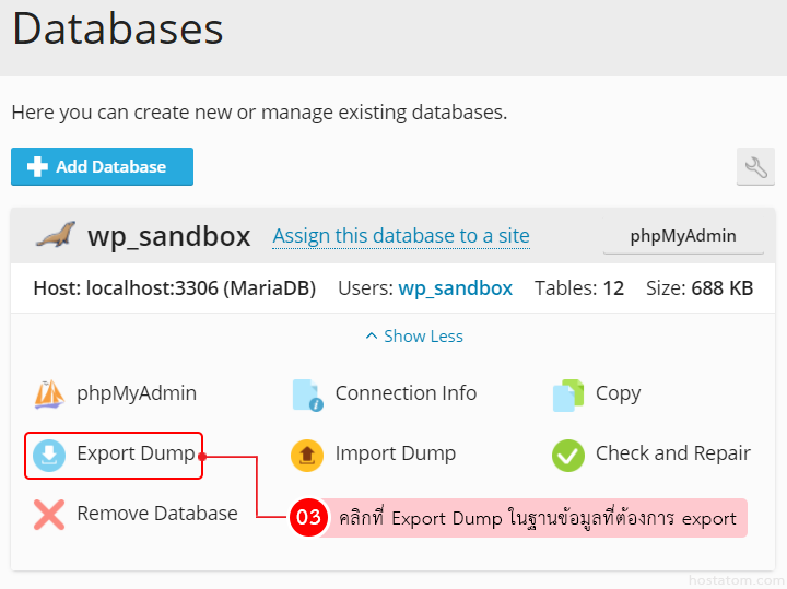 2. คลิกที่ Export Dump ในฐานข้อมูลที่ต้องการ export