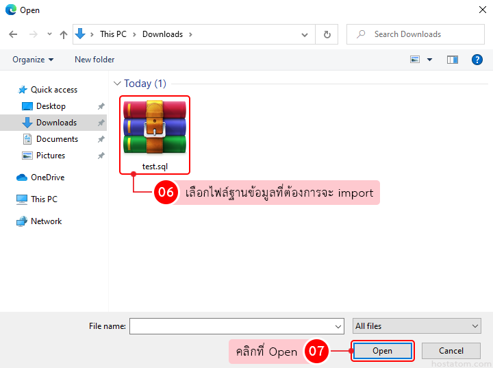 3.1.2 เลือกไฟล์ฐานข้อมูลที่ต้องการจะ import จากนั้นคลิกที่ Open