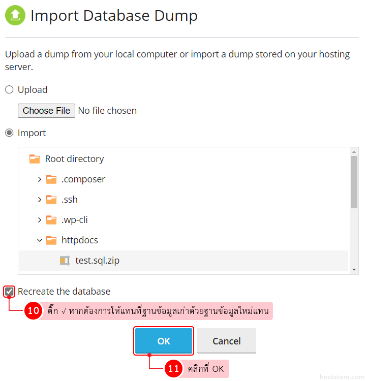 4. หากต้องการให้แทนที่ฐานข้อมูลเก่าด้วยฐานข้อมูลใหม่แทน ให้ติ๊กถูกที่ Recreate the database จากนั้นคลิกที่ OK