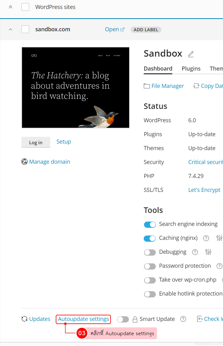 คลิกที่ Updates ในเว็บไซต์ WordPress ที่ต้องการตั้งค่าการอัปเดต