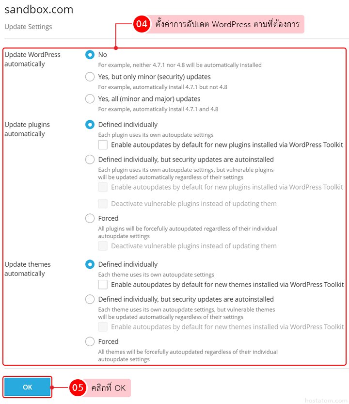 ระบบจะพามาที่หน้าตั้งค่าการอัปเดต WordPress ให้ตั้งค่าตามที่ต้องการ