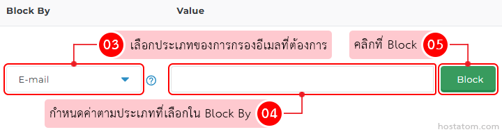 - Block By เลือกประเภทของการกรองอีเมลที่ต้องการ