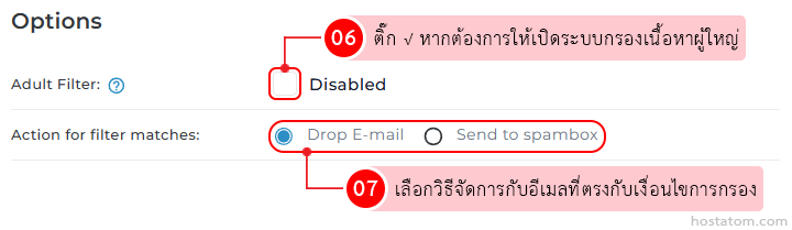 - หากต้องการตรวจสอบอีเมลก่อนลบ แนะนำให้เลือก Send to spambox แทนการ Drop ทันที