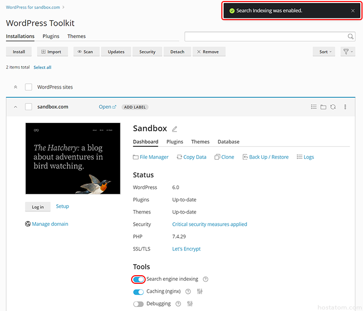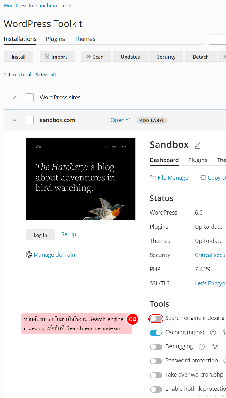 search engine indexing คือ การอนุญาตให้ Googlebot เข้ามาทำการเก็บข้อมูลเว็บของคุณ โดยใน control panel ของ Plesk จะมีเมนู WordPress Toolkit ให้สามารถเปิด/ปิด search engine indexing ได้ด้วยตัวเองตามขั้นตอนต่อไปนี้