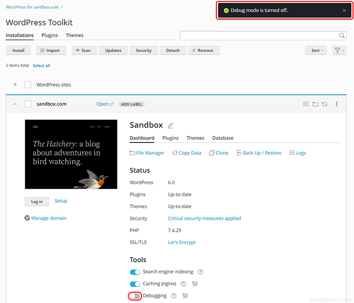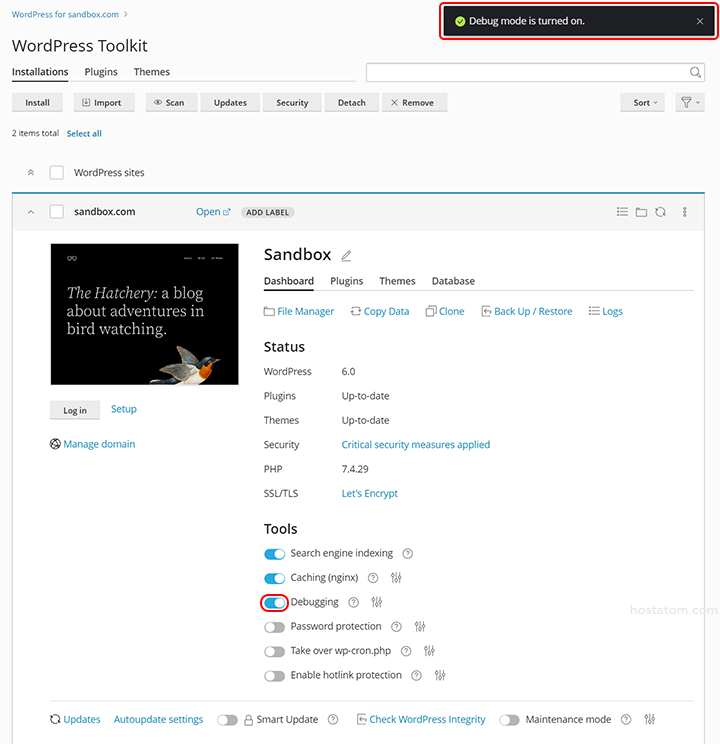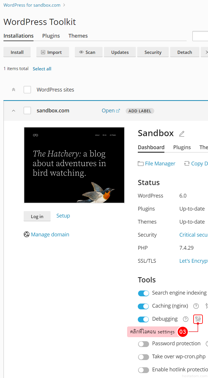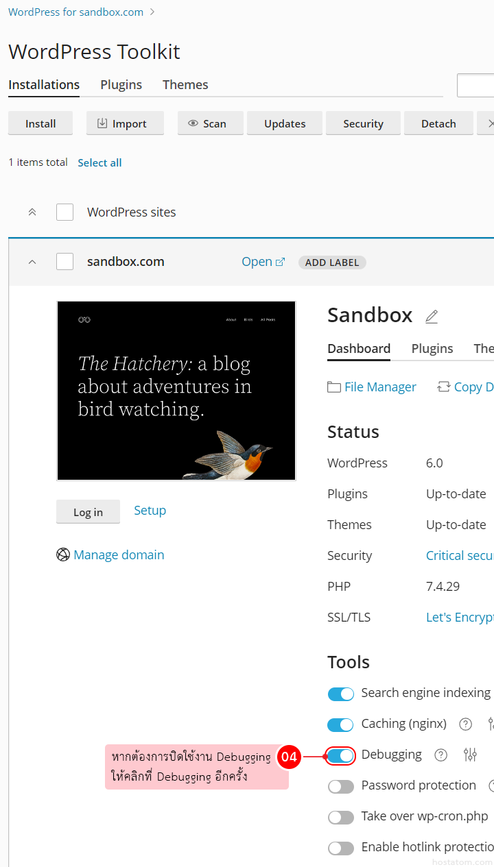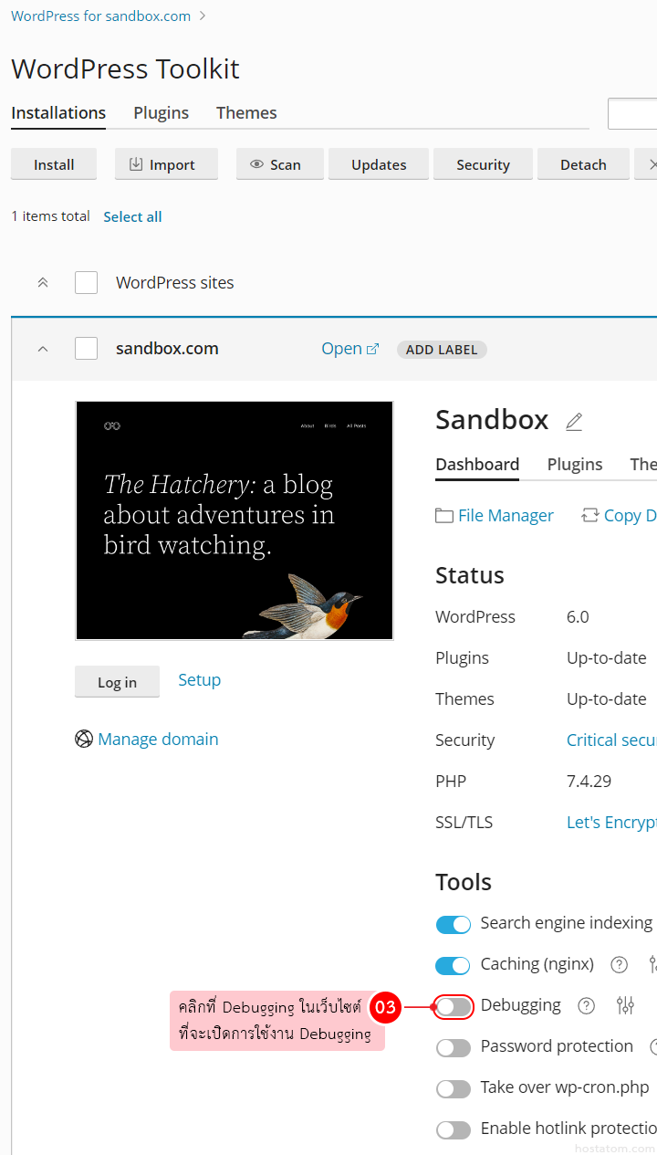 Debug คือ การเปิดแสดง error ให้เห็นถึงความผิดปกติของเว็บไซต์ ซึ่งปกติแล้วคนที่ใช้งานในส่วนนี้มักจะเป็นนักพัฒนาเว็บไซต์ และมักจะเป็นการตรวจสอบและแก้ไขก่อนใช้งานเว็บจริง หรือหากต้องการทำ debug แนะนำให้ทำบนเว็บจำลองหรือทำการ clone เว็บขึ้นมาเสียก่อน และสำหรับ WordPress Toolkit มักจะมีตัวเลือกให้จัดการเกี่ยวกับ debug ที่สำคัญๆ ได้ สำหรับการเปิด-ปิดและตั้งค่า Debugging ด้วย WordPress Toolkit สามารถดำเนินการได้ตามขึ้นตอนดังนี้